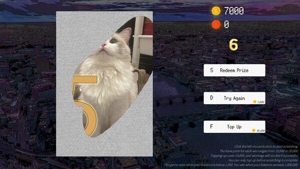 Players can enjoy a scratch-off lottery-style game. Scratch the coating, and if the numbers match the winning number, you’ll win a cash prize! Even if you don’t win, don’t feel down—adorable cats will keep you company. If the basic prize isn’t enough for you, you can take on the "Raise the Stakes" challenge. The higher the risk, the greater the reward! But be careful—if you’re not cautious, you might lose everything and face game over. When your winnings exceed 1,000,000, you achieve victory in the game! Raise the Stakes The game offers a "Raise the Stakes" option where higher risk means higher rewards. Players can spend 10,000 to raise the stakes. If you win, the amount staked will be returned as double! However, if you lose, the staked amount will be lost forever. Cat Scratch Cards Each scratch-off card features a picture of one of our adorable cats. Feel free to give them a gentle pat!