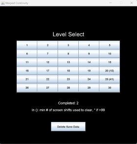 Warped Continuity is a puzzle platform game based on the Indie game Continuity, but it includes the ability to reverse gravity, create a block, and remove blocks in some levels. The game uses Java graphics, but the concept of the game doesn't require fancy graphics to work.