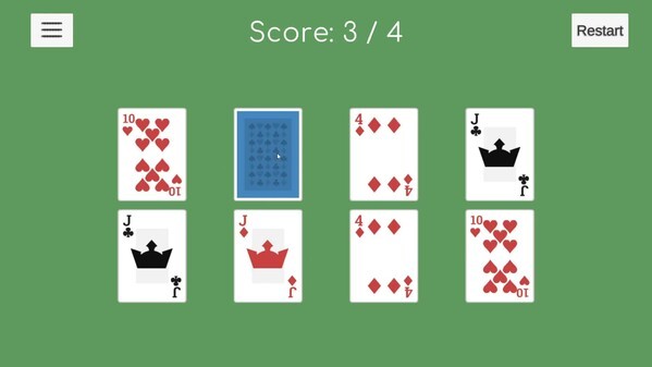 这是一款锻炼记忆能力的卡牌游戏: 1.一开始,所有卡片都是随机生成,可以确定的是相同的卡片只有2张. 2.鼠标点击卡片会转为正面,这个时候玩家需要记住每张卡片的信息(包括数字\颜色\位置) 3.连续点击相同的卡片时,卡片将不会转回去背面,屏幕中间会记录卡片种类总数和已经找到的卡片数量. 4.当所有卡片都转为正面时,闯关成功! 越往后的关卡玩家需要记住的卡片越多,尽量在最短的时间内完成所有卡片翻转,快来挑战吧!
